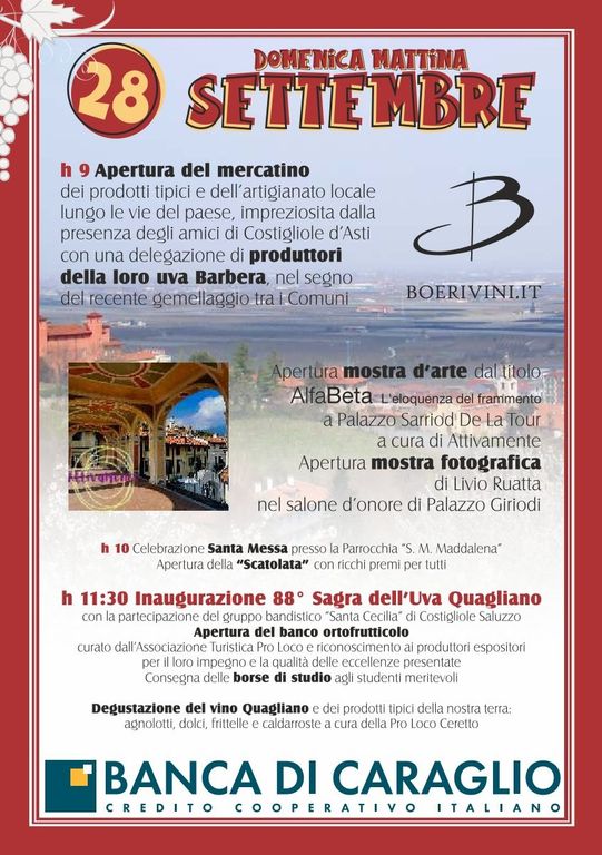 Per la ricorrenza dell'88^ Sagra dell' Uva Quagliano è stato organizzato un ricco programma di appuntamenti ed eventi che vede la sua partenza il venerdì 26 settembre con cena a base di polenta e spezzatino e a seguire intrattenimento musicale con il gruppo “Firme d'Autore in Concerto”.