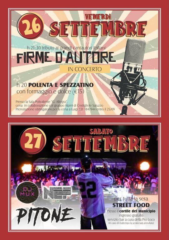 Nella serata di Sabato 27 settembre dalle ore 19,30 cena con ambulanti street food in Via Vittorio Veneto e a seguire serata musicale con Dj set nel cortile del Municipio con DJ MUX, NEF e PITONE.