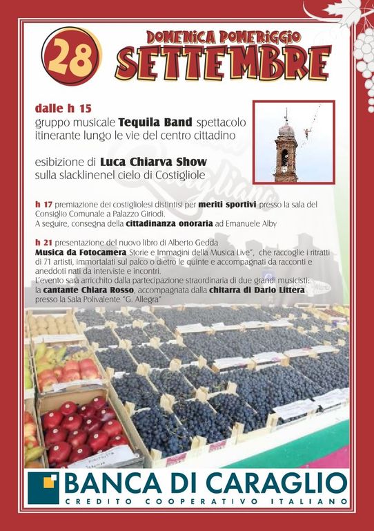 - Dalle ore 17 premiazioni dei costigliolesi distintisi per meriti sportivi e a seguire, consegna della cittadinanza onoraria di Costigliole Saluzzo ad Emmanuel Alby presso la Sala consigliare di Palazzo Giriodi.