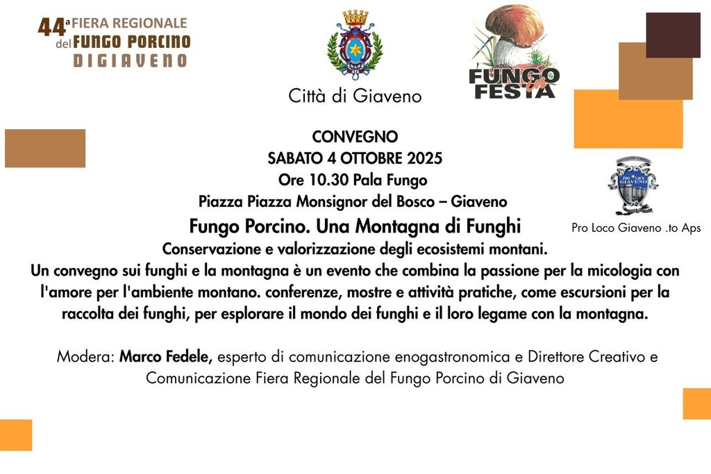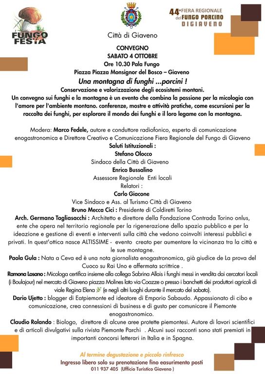 Il convegno di questa edizione - dal titolo Fungo Porcino. Una Montagna di Funghi - pone al centro del dibattito la conservazione e valorizzazione degli ecosistemi montani, nonché il giusto equilibro necessario tra la passione per la micologia e il rispetto per l’ambiente. Il convegno moderato da Marco Fedele, Direttore creativo e comunicazione della Fiera Regionale del Fungo di Giaveno vedrà la partecipazione istituzionale di Enrico Bussalino, Assessore Enti locali della Regione Piemonte, di Stefano Olocco, Sindaco della Città di Giaveno e di Ivana Usseglio Viretta, Presidente Pro Loco Giaveno.