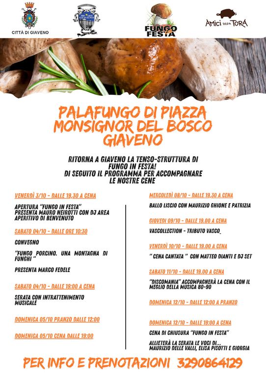 L’apertura di Fungo in festa è prevista dunque per venerdì 3 ottobre con il taglio del nastro del PalaFungo (in Piazza Monsignor del Bosco) a cura della Proloco di Giaveno.