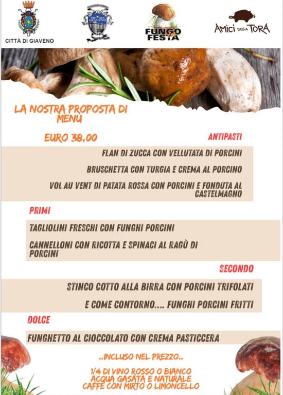 All’interno della struttura si terranno gustosissime cene con menu a base di fungo porcino con piatti realizzati dallo chef Manuel Raffa del ristorante Gli Amici della Tora (3 antipasti, 2 primi, 1 secondo con contorno di funghi porcini fritti e trifolati, dolce e bevande incluse 38 €). Nell’ottica della massima inclusività sono previsti menu vegetariani, senza glutine e bimbi (15 €).