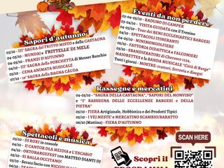 Sapori di Autunno. Si parte venerdì 3 ottobre con la 11ª Sagra del Fritto Misto e della Castagna, per proseguire Sabato 4 ottobre con i Mundaj e le Frittelle di mele e, sempre sabato, la III Sagra della Porchetta di Messer Banchio. Pranzi di autunno e Cena Animata domenica sera 5 ottobre.