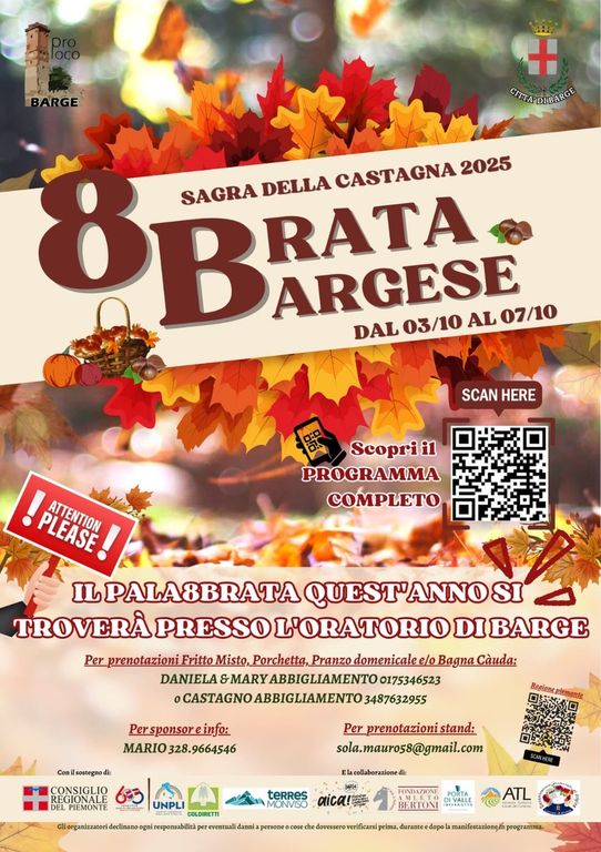 Rassegne e Mercatini. Dal 4 al 5 ottobre si svolgeranno: la Sagra della Castagna, Sapoti del Monviso e la 1^Rassegna delle Eccellenze Bargesi e della Pietra, mentre domenica 5 ottobre sarà dedicato alla Fiera Artigianale, Hobbistica e dei Prodotti Tipici, ai Vei Meste e al Mercatino Scambio/Baratto.