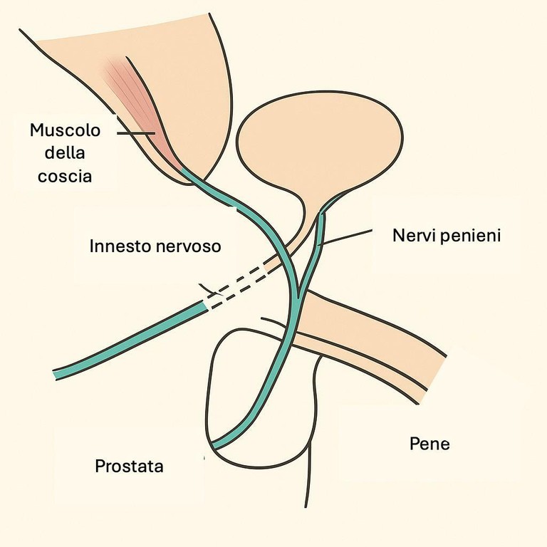 L’operazione prevede il collegamento di un nervo di un muscolo della coscia (nervo gracile) direttamente ai nervi del pene (fibre nervose autonomiche dei corpi cavernosi) che controllano l’erezione. Un approccio totalmente nuovo, che mira a riattivare il meccanismo naturale dell’erezione nei casi molto frequenti in cui i farmaci orali (pillole blu e derivati) non funzionano.
