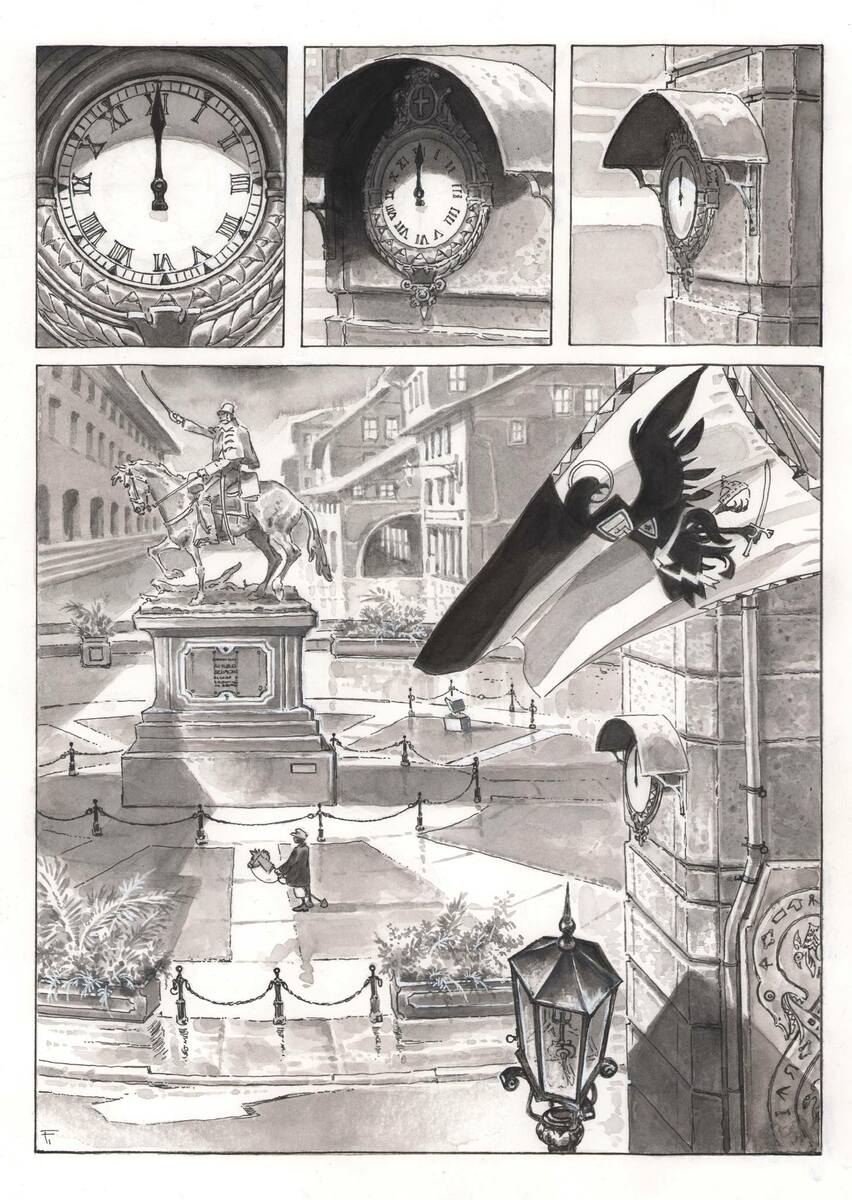La lavorazione sul volume mi ha impegnato molto, e non solo da un punto di vista tecnico, cioè la realizzazione effettiva delle tavole, ma anche e soprattutto sotto l'aspetto narrativo, tanto che, durante la ricerca sviluppata prima di iniziare a lavorarci in concreto, ho cominciato a ipotizzare una sorta di "racconto parallelo", diciamo così, composto da simboli, rimandi ad autori diversi, opere d'arte o citazioni grafiche. Un racconto che si è sviluppato dalla prima fino all'ultima tavola, suggerendo ai lettori spunti visivi su cui soffermarsi e, spero, riflettere.