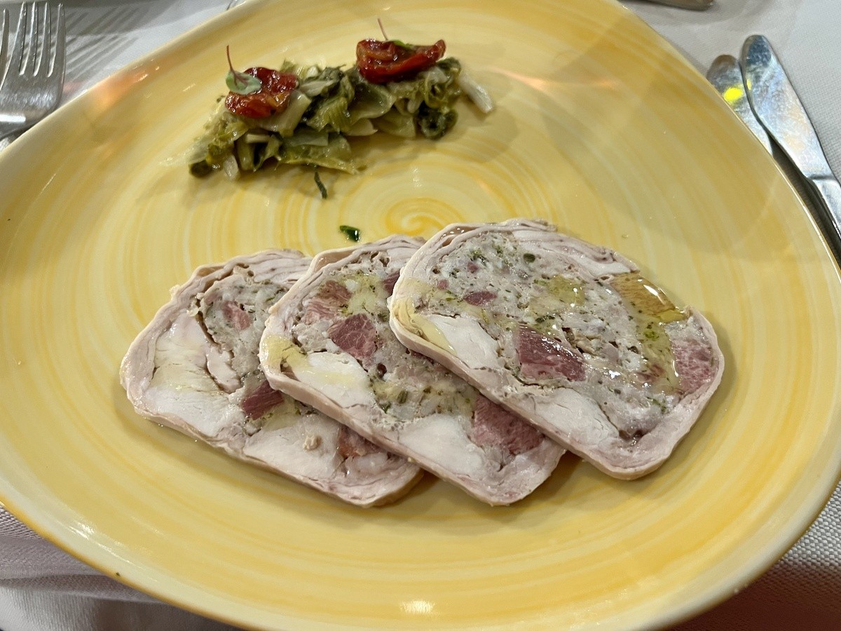 Salite le scale che dal parcheggio portano alle sale dove ceneremo, passiamo a fianco di un dehors con già diversi tavoli occupati. L’idea di accomodarci in questo spazio ci sfiora, ma preferiamo prendere posto in una delle sale interne, nella quale il rustico si sposa con un essenziale tovagliato bianco la cui sobria eleganza che dà alla sala una luminosità in tono con ciò che questo locale vuol’essere. Ed è qui che, dopo un benvenuto rappresentato da croccanti Focaccine farcite, come da nostra scelta ad arrivare in tavola sono due antipasti che parlano di territorio: prima una Terrina di coniglio e lingua dal sapore coraggioso e benbilanciato;