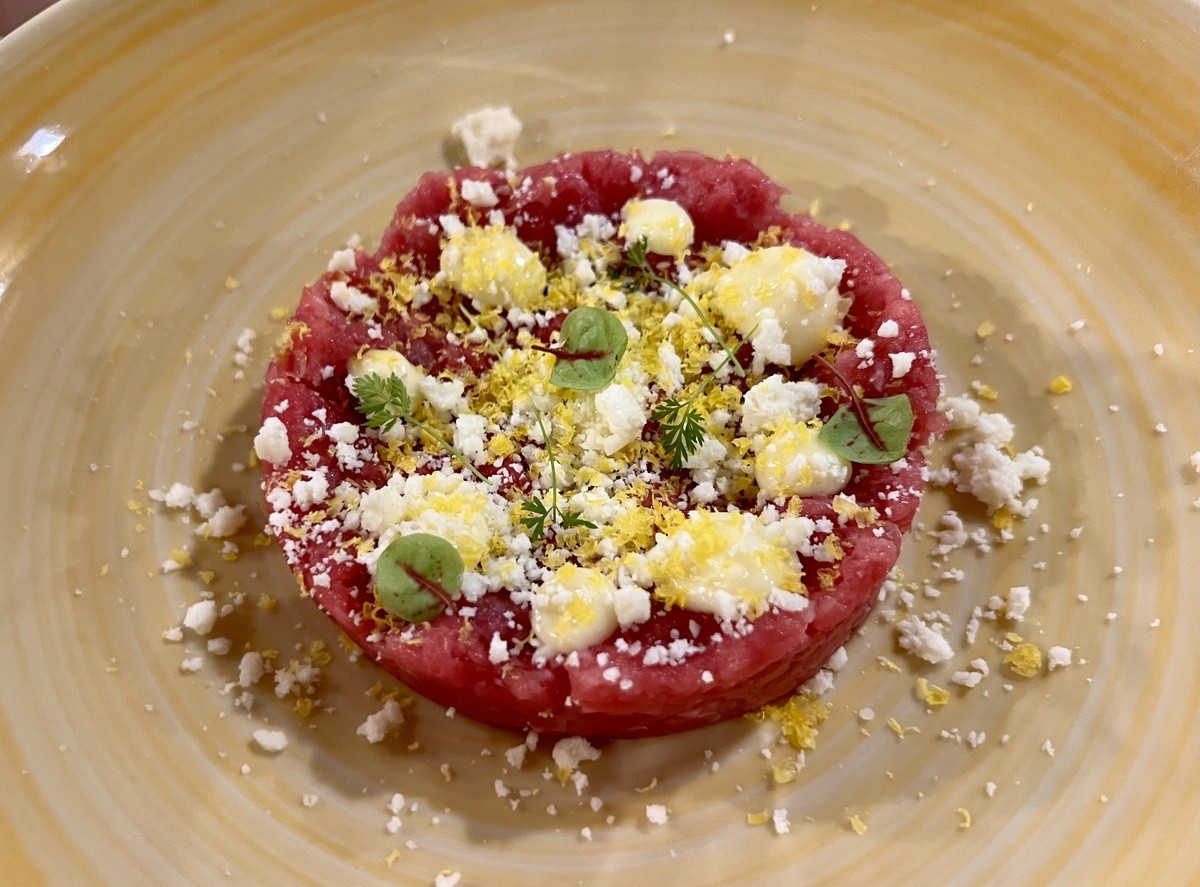 e poi un’essenziale Carne battuta “Unica” Martini efficacemente guarnita con tuorlo d'uovo marinato, maionese al limone e Castelmagno.