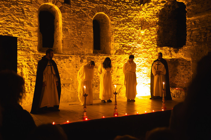 Attori, musicisti, acrobati e giocolieri di fuoco raccontano la storia di Adelaide e Guglielmo, due amanti proibiti la cui fiamma continua a brillare secoli dopo la loro tragica fine. Tra tessuti aerei sospesi, melodie che vibrano nell'aria e danze di fuoco che illuminano la notte, lo spettatore viene guidato in un viaggio sospeso tra mistero e incanto, dove le anime dei due innamorati trovano finalmente libertà.
