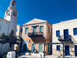 Pochi metri più in alto, una piazzetta si apre all’improvviso: tavoli di legno, un muro bianco con una sola parola scritta in nero — “Mediterraneo”. È impossibile non pensare al film di Gabriele Salvatores, girato qui e premiato con l’Oscar. Una storia di uomini sospesi tra la guerra e una terra remota che li disarma, prima ancora di accoglierli. Quella scritta non è decorazione: è memoria sedimentata, più incisiva di qualunque brochure. Attorno, muri scrostati e facciate restaurate convivono senza spiegazioni; la scena è vuota e viva allo stesso tempo, come se qualcuno dovesse comparire da un momento all’altro. Poco distante si trova la Santrapeia School, fondata nel 1903 della diaspora greca che è uno degli edifici simbolo di Kastellorizo. La sua architettura neoclassica, con colonne e timpano, testimonia il periodo di grande sviluppo a inizio Novecento, quando cultura e commercio fiorivano grazie alla posizione strategica e al momento storico. Oggi l’edificio resta un punto di riferimento solo identitario per gli abitanti.
