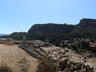 Pochi metri più in alto, una piazzetta si apre all’improvviso: tavoli di legno, un muro bianco con una sola parola scritta in nero — “Mediterraneo”. È impossibile non pensare al film di Gabriele Salvatores, girato qui e premiato con l’Oscar. Una storia di uomini sospesi tra la guerra e una terra remota che li disarma, prima ancora di accoglierli. Quella scritta non è decorazione: è memoria sedimentata, più incisiva di qualunque brochure. Attorno, muri scrostati e facciate restaurate convivono senza spiegazioni; la scena è vuota e viva allo stesso tempo, come se qualcuno dovesse comparire da un momento all’altro. Poco distante si trova la Santrapeia School, fondata nel 1903 della diaspora greca che è uno degli edifici simbolo di Kastellorizo. La sua architettura neoclassica, con colonne e timpano, testimonia il periodo di grande sviluppo a inizio Novecento, quando cultura e commercio fiorivano grazie alla posizione strategica e al momento storico. Oggi l’edificio resta un punto di riferimento solo identitario per gli abitanti.