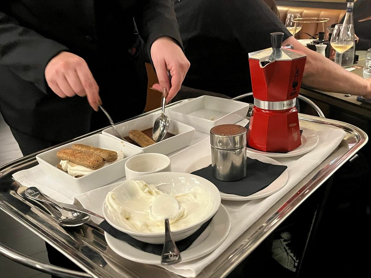 Si va verso la fine della cena col Tiramisù al minuto, preparato direttamente al tavolo con savoiardi, caffè della Moka, crema di tiramisù (richiama incredibilmente la “fioca” piemontese) e polvere di cacao. Chiusura con un caffè espresso che, lasciando in bocca un leggero sapore di bruciato, risulta obiettivamente un po’ sottotono rispetto alla complessità della cena.