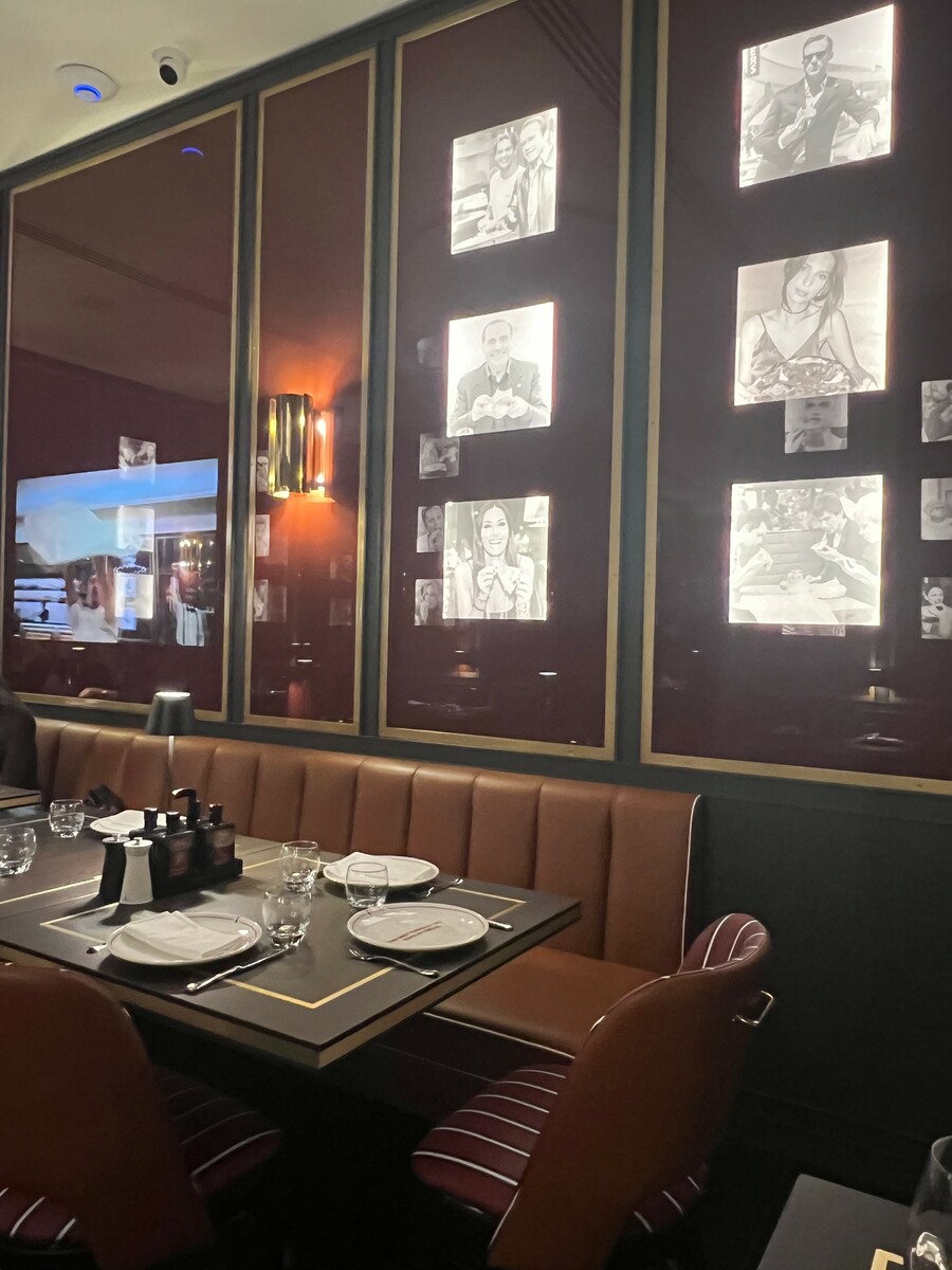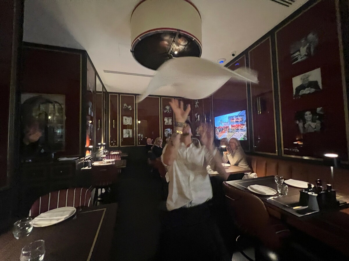 L’accoglienza è sorridente, il locale bello pieno. Lascio la mia giacca al guardaroba e, su richiesta, opto per un tavolo un po’ defilato. La musica è piuttosto alta, l’atmosfera festosa, lo stile tra il sofisticato e il vintage. Non proprio il posto che sceglierei per mangiare una pizza. Quella che mi aspetta però – lo ha detto Briatore stesso – non sarà una serata in pizzeria, ma un’esperienza. E allora che esperienza sia. L’arrivo in tavola del menu cartaceo è praticamente immediato: scritto in inglese/italiano e, per un boomer come me, a caratteri davvero troppo piccoli. Mi aggiusto col QR-code e, con chi mi accompagna, ordiniamo alcuni piatti, scegliendo dalla lista dei vini (da 40 a 1500 €, con proposte al calice da 9 a 14 €) un’etichetta di Montepulciano d’Abruzzo. Ad arrivare per primo in tavola è un buon piatto, fresco e ben costruito oltre che accompagnato da una croccante focaccia, di fresca Bufala servita con datterini rossi e gialli.