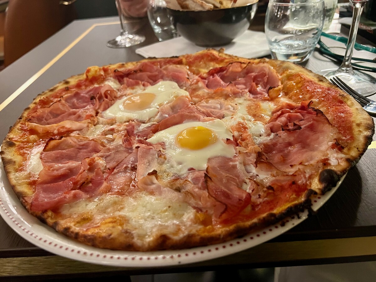 Comme il faut la Pizza alla Bismark: impasto sottile e leggero, croccante fino al bordo quasi assente, uova cotte al punto giusto e sapore pieno, già porzionata, da gustare fino all’ultimo morso.