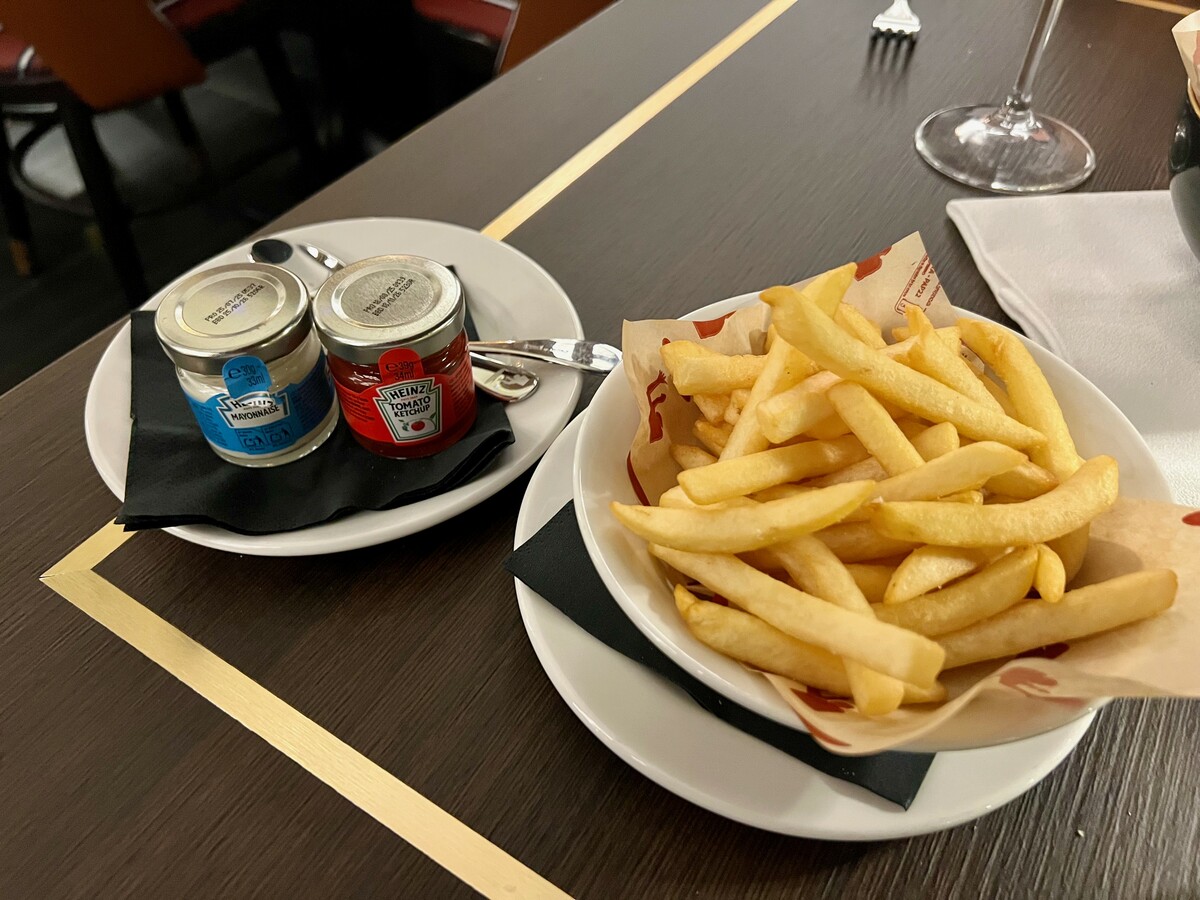 Per finire il vino chiediamo un piatto di Patatine fritte che, richieste senza tartufo nero e Parmigiano, arrivano dorate e cotte al punto giusto, oltre che accompagnate da due vasetti ancora chiusi di maionese e ketchup Heinz.