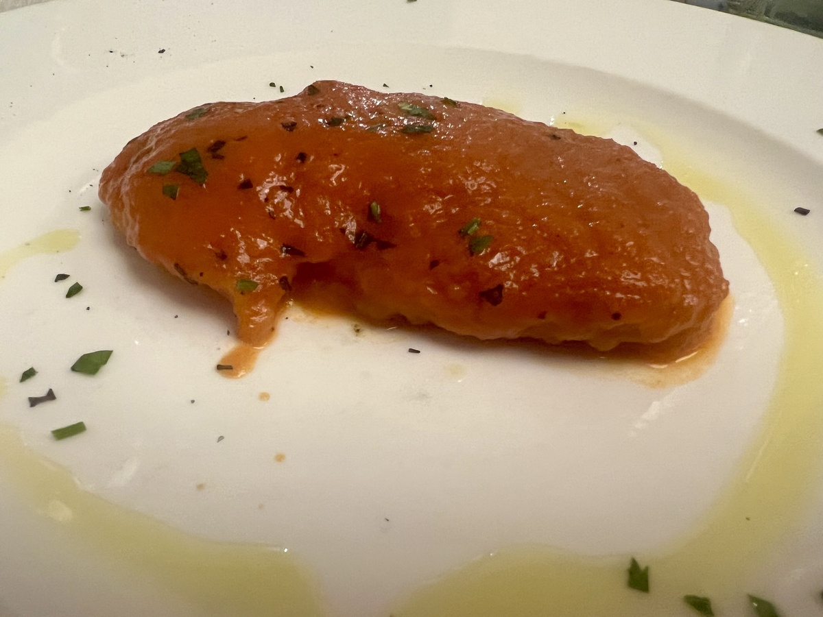 Anche i Gamberi speziati non scherzavano affatto, nel loro lasciar affiorare una speziatura leggera del tutto in tono col crostino di pomodoro fresco proposto in abbinamento.
