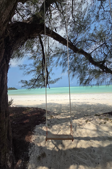 Il viaggio continua verso Shamiani Island, conosciuta anche come Kiweni Island. Si raggiunge combinando pulmino e barca, seguendo i ritmi delle maree, e regala la sensazione di arrivare nel giardino dell’Eden. In questo luogo il vuoto è il protagonista. Le spiagge sono deserte, le acque limpide e calme, la foresta scende fino al mare. Sulla riva, un’altalena appesa a un albero oscilla dolcemente di fronte all’oceano. È un simbolo perfetto dell’isola: semplice, autentica, capace di restituire spazio senza aggiungere nulla di superfluo. Qui si trova anche Emerald Beach, una distesa di sabbia chiarissima che scintilla al sole e prende il nome dai riflessi verdi e turchesi del suo mare. È pura scenografia naturale, un tratto di costa che ipnotizza. Qui è stata costruita una struttura ricettiva pensata per inserirsi nell’ambiente circostante, senza intaccarne l’equilibrio. Non è un resort, ma un rifugio eco-sostenibile che dialoga con la natura anziché dominarla.