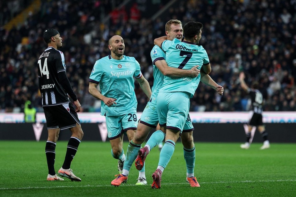 UDINE (ITALPRESS) - Il Bologna continua a sognare a occhi aperti. I ragazzi di Vincenzo Italiano espugnano il Bluenergy Stadium, vincendo 3-0 contro l'Udinese. Dopo il rigore fallito da Orsolini, la doppietta di Pobega e il gol di Bernardeschi valgono il terzo successo consecutivo degli emiliani, che volano in vetta alla classifica della Serie A, in attesa delle altre gare, a pari punti con Inter e Roma.Dopo appena 4' i padroni di casa si ritagliano la prima occasione con Davis che, su suggerimento di Kamara, tenta la conclusione sfiorando un gran gol. Archiviato lo spavento, la squadra rossoblù prova a prendere in mano le redini della sfida, ma non riesce a trovare sbocchi sul fronte offensivo. Orsolini al 24' si accentra e prova la conclusione da lontano, ma sbaglia completamente la traiettoria. Al 36' Pobega tenta il tiro da fuori, ma trova la deviazione con un braccio di Ehizibue: dopo un lungo controllo del Var, l'arbitro Sacchi decide di assegnare un calcio di rigore ai felsinei. Sul dischetto si presenta Orsolini, che però si fa ipnotizzare da uno straordinario Okoye, bravo a respingere la conclusione dell'attaccante avversario. In pieno recupero l'ex giocatore dell'Ascoli va a segno, ma il suo gol viene annullato per fuorigioco. Si va, dunque, a riposo sul parziale di 0-0.Nella ripresa il Bologna torna in campo con il piglio giusto e al 54' trova la rete del vantaggio con Tommaso Pobega: il centrocampista riceve palla da Orsolini, si accentra e con il destro batte Okoye. L'Udinese accusa il colpo e al 60' combina un pasticcio difensivo con Okoye e Karlstrom, che regalano a Pobega il pallone che vale il 2-0 e la sua doppietta personale: l'ex Milan ruba palla allo svedese e supera agevolmente il portiere avversario. Mister Runjaic decide di stravolgere la sua squadra, effettuando tutte le cinque sostituzioni nell'arco di pochi minuti, ma le sue mosse non sortiscono i risultati sperati. A sfiorare il gol, infatti, sono ancora gli ospiti con Fabbian, che al 70' si divora il tris sprecando una bella giocata di Zortea. Nel finale i bianconeri cercano in maniera velleitaria di riaprire la contesa, ma gli emiliani si difendono bene e, dopo un malinteso tra Bertola e Zanoli, chiudono definitivamente i giochi con il primo gol in rossoblù di Federico Bernardeschi. Festa in casa Bologna; domande e dubbi sul fronte friulano.- foto Image -(ITALPRESS).
