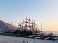 La costa del Mugla alterna calette remote e zone affollate. Ölüdeniz rappresenta uno dei punti in cui questo dualismo è più evidente. Non è un luogo incontaminato, ma un luogo parzialmente addomesticato. La laguna offre contemplazione e silenzio: accessibile, fotografabile, ordinata. È la parte del racconto che procede lenta, come un respiro lungo. Pochi metri più in là, la cittadina spinge nella direzione opposta. Dopo mezzogiorno la musica aumenta, le “navi pirata” imbarcano turisti per i tour costieri e i bar fronte mare si riempiono. Le insegne si accendono in anticipo, ogni attività gareggia per attirare attenzione. La scena è frontale: vitalità dichiarata, commercio, colore. Lo sguardo, qui, è costantemente chiamato a scegliere. È un piccolo bivio, ripetuto decine di volte nell’arco della giornata. Ogni particolare racconta un diverso modo di stare in questo luogo. Molti turisti arrivano dal Nord Europa e dalla Russia: in alcuni periodi la popolazione si moltiplica, passando da poche centinaia di residenti a migliaia di presenze temporanee. Il luogo cambia forma a seconda della stagione, come un organismo che si espande e si ritrae.