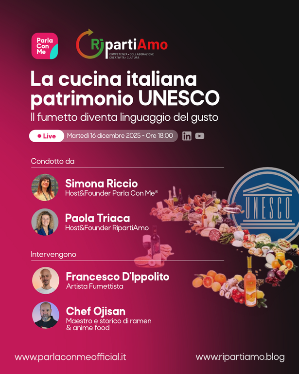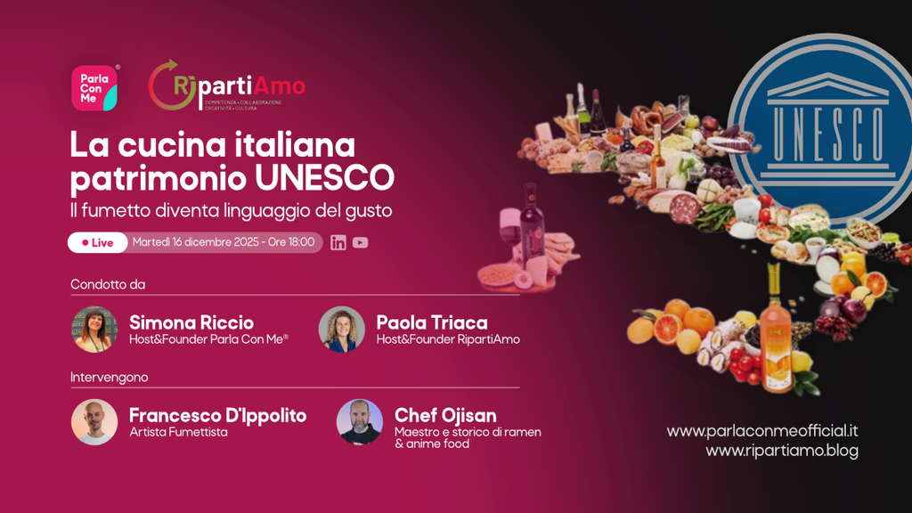 Ma come si racconta oggi questo patrimonio? E quali linguaggi possono renderlo vivo, accessibile e comprensibile anche alle nuove generazioni? A queste domande prova a rispondere la live condivisa Parla Con Me® × RipartiAmo, dal titolo: “La cucina italiana Patrimonio UNESCO – Il fumetto diventa linguaggio del gusto”, in programma: