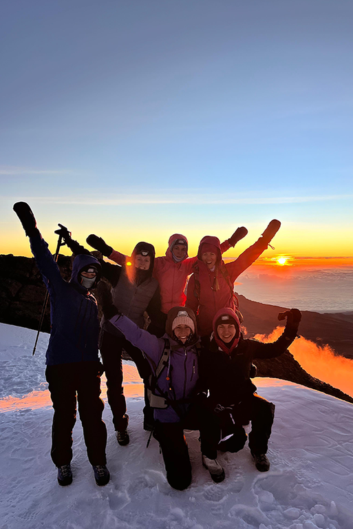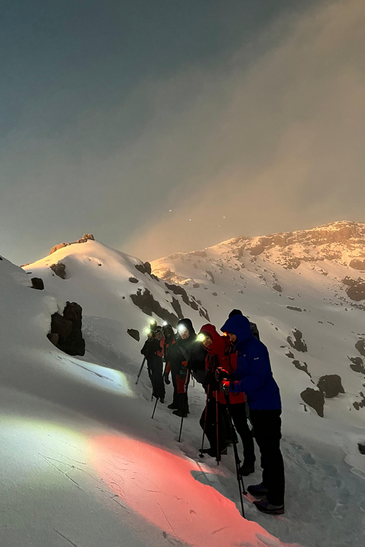 Si va a dormire presto, sveglia a mezzanotte, partenza verso l’una. Indossiamo ogni strato possibile, accendiamo le frontali e ci mettiamo in fila. Ognuna di noi ha una guida personale. Nel buio vedi soltanto i piedi della persona davanti a te: un ritmo ipnotico. Le guide ripetono “Pole pole, acqua”. È la regola che salva: andare piano per non cedere alla quota. A 5.400 metri il mio corpo si ribella. Nausea, mal di testa, l’acqua congelata perché non avevo la sacca termica. Non riesco più a bere. A un certo punto scoppio a piangere. Proviamo a superare un gruppo più lento, acceleriamo, e sto peggio. La tentazione di fermarmi si fa concreta. Le guide mi tolgono lo zaino. Amador, il responsabile, mi dice: “Vieni dietro di me”. Rallenta ancora per tenermi nel gruppo. Poco prima del Gilman’s Point sono sfinita: mi fermo, non vedo la fine. Mancano trecento metri di dislivello: a quella quota sembrano un’eternità. Mi riprendo con le gambe che avanzano per inerzia, la mente resiste a fatica. So solo che Mari è già arrivata e mi aspetta. Quando finalmente la raggiungo, mi corre incontro e mi abbraccia. Io crollo. Piango, ma è un pianto diverso: un rilascio totale, una gratitudine immensa. Una delle emozioni più profonde della mia vita.