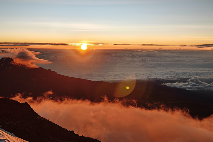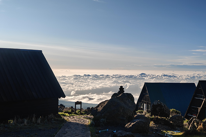 Volentieri. Da Arusha si parte con un miscuglio di euforia e timore, come se l’aria presagisse qualcosa di magico e inaspettato. Gli zaini sono pronti, l’energia è alta, ma la montagna non smette d’impressionare. Siamo in ritardo e la pioggia battezza i primi passi. La foresta pluviale ci avvolge subito: è umida, scura, viva. Il sentiero è un intreccio di fango e radici, e ogni appoggio diventa un gesto di attenzione. Il giorno seguente tutto cambia. La vegetazione si apre e si entra nel Moorland: arbusti bassi e luce piena. Horombo Hut, a 3.720 metri, sembra sospeso tra due dimensioni. Da Zebra Point la vista si distende tra rocce minerali e orizzonti netti, una sensazione di calma che spiazza. Poi si sale verso Kibo Hut, dove resta solo la nudità della montagna: pietra, sabbia, vento. L’altitudine comincia a bussare, il corpo rallenta. La notte non è riposo: è vigilia. Tutto converge verso il momento decisivo.