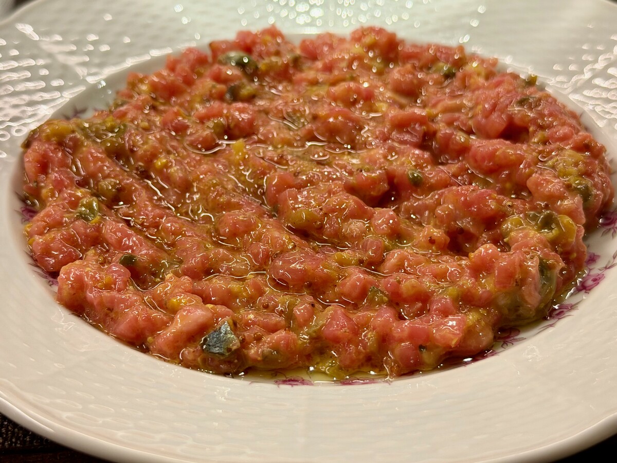 purtroppo ricoperta da una misticanza che non valorizza certo il piatto, e una ben calibrata Battuta alla francese il cui impiattamento si evidenzia per un’essenzialità forse eccessiva.