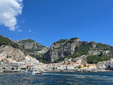 Proseguendo in battello, si arriva a Positano. L’immagine più diffusa e iconica della Costiera. Dal mare si presenta come una diagonale netta: una sequenza ordinata di volumi, tra rosa pallido, pesca e bianco. Terrazze sovrapposte e balconi fioriti costruiscono un’immagine riconoscibile, modellata sul profilo del promontorio. L’impatto visivo è forte e coerente. L’economia locale è fortemente orientata all’accoglienza: boutique, hotel panoramici e ristoranti affacciati sul mare testimoniano una trasformazione che ha consolidato la vocazione turistica del paese. La bellezza è organizzata e resa esperienza strutturata.