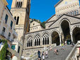Osservata dal mare, diventa più leggibile. I Paesi appaiono come incastri geometrici sospesi, le terrazze agricole come gradini scolpiti nei versanti, la via costiera come una linea sottile ritagliata nella pietra. Dal largo si coglie un sistema costruito contro la gravità, dove nulla è casuale e ogni spazio è stato conquistato. Vietri sul Mare rappresenta la soglia della Costiera. È il punto in cui il paesaggio conserva ancora una certa apertura e la verticalità non è dominante. Le cupole maiolicate riflettono la luce con intensità, le facciate colorate dialogano con il cielo e con il mare. La tradizione della ceramica costituisce l’elemento più evidente: botteghe e laboratori raccontano una continuità artigiana che ha dato al luogo una riconoscibilità internazionale. Andando oltre, la morfologia cambia rapidamente. Partendo via mare, tutto si avvicina. Amalfi appare all’improvviso, raccolta e quasi protetta da “madre natura”. Una parete di case color crema e giallo che sale una sopra l’altra, senza spazi vuoti. La spiaggia è una mezzaluna compatta, il porto un incastro preciso di moli e barche. Sbarcare significa entrare in un sistema verticale. La scalinata del Duomo domina la piazza e segna la direzione: verso l’alto. Ma basta infilarsi in un vicolo per sentire la vera natura del luogo. Archi bassi, muri segnati dal tempo, intonaci che portano tracce di umidità e sale. Le finestre sono ravvicinate, le pareti quasi si sfiorano.