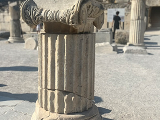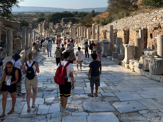 Scendendo verso la costa dell’Egeo, l’aria si fa più umida. Gli ulivi occupano le colline con eleganza geometrica. Tra pendii chiari e sentieri polverosi appare Efeso. Non è solo un sito archeologico: è la testimonianza di un sistema urbano complesso. La via principale scende, verso il basso, tra pavimentazione perfetta e capitelli caduti. Commercio, culto, politica: tutto organizzato con precisione romana. La Biblioteca di Celso domina la prospettiva. La facciata, con colonne sovrapposte e nicchie allegoriche, è un manifesto di comunicazione visiva. È un edificio pensato per essere guardato frontalmente, per produrre consenso attraverso la proporzione. I visitatori si dispongono davanti come un pubblico in attesa dello spettacolo. Poco oltre, il Grande Teatro apre la sua curva verso la pianura: migliaia di posti scolpiti nella collina, un’architettura che organizza voce e sguardo. Efeso non suggerisce malinconia. È un manuale a cielo aperto su come si viveva. Ma è anche la dimostrazione di come le “cose" cambino.