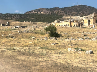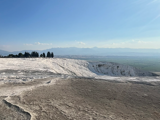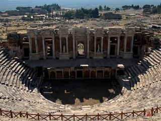 Lasciato questo luogo, la pianura riprende la parola. Per chilometri non accade quasi nulla. Poi la superficie cambia colore. Una scarpata bianca appare come un errore ottico nel paesaggio: Pamukkale. Le terrazze calcaree non sono un effetto scenografico ma il risultato di un processo millenario. L’acqua termale deposita carbonato di calcio, strato dopo strato. Il bianco non è candore: è accumulo. È il segno visibile di un tempo che sedimenta con pazienza. Camminare su quelle superfici significa percepire una materia che continua a trasformarsi anche quando sembra cristallizzata. Le vasche riflettono il cielo, ma sotto la superficie l’acqua lavora ancora. Sopra le terrazze si estendono le rovine di Hierapolis. Teatro, necropoli, strade ortogonali: la città romana osservava la valle con sicurezza ingegneristica. Qui natura e progetto umano condividono lo stesso panorama. La pietra scavata dall’uomo e quella depositata dall’acqua convivono senza conflitto. Pamukkale non racconta una vittoria, ma una coabitazione. La solidità come visione nei “secoli dei secoli”.