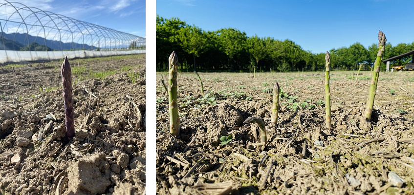 La varietà principale è l’Eros, un asparago dal portamento elegante: turrioni dritti e compatti, mai vuoti all’interno, con apice ben chiuso, colore verde intenso sfumato di viola tenue e un profumo delicato e persistente. Al gusto si rivela straordinariamente dolce, tenero, privo di qualsiasi fibrosità o retrogusto amarognolo, e incredibilmente digeribile.