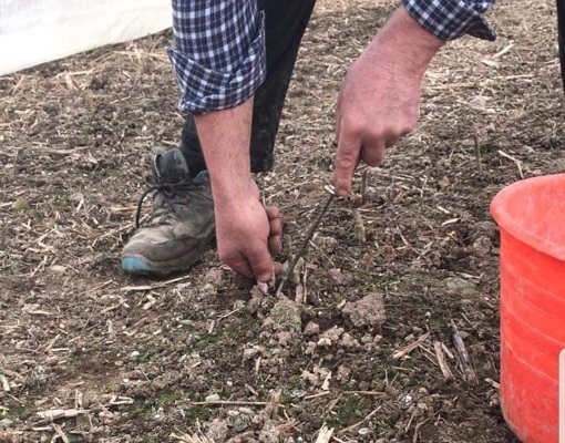 Una parte della produzione avviene in serre per anticipare la raccolta, mentre la restante cresce all’aperto: da metà aprile inizia la raccolta manuale, effettuata con un attrezzo speciale progettato proprio da Piero per preservare al meglio la qualità del prodotto.
