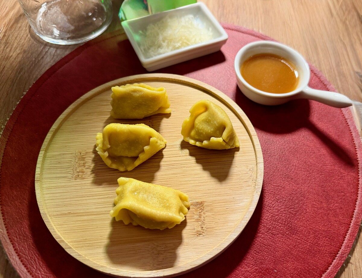 Veniamo dunque ai piatti. Con uno sfumato sottofondo musicale firmato Ray Charles, arriva un primo piatto a sorpresa: dei curiosi Plin con soia e parmigiano, splendidamente accompagnati da un calice di morbido e avvolgente Pedro Ximénez, rappresentano uno dei passaggi più riusciti.