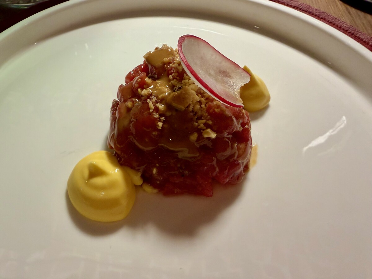 Il G.A.F., sul suo sito ufficiale, definisce sé stesso come “bistronomia e cocktail d’autore”. I cocktail io però non li ho assaggiati e li lascio a chi ama cenare con questi drink sicuramente eccellenti. Da boomer quale ormai sono, mi sono accontentato (si fa per dire!) dei vini, partendo da una carta che offre l’opportunità di accompagnare il percorso gastronomico con coerenza, privilegiando una selezione non ampia ma mirata e consentendo abbinamenti capaci di valorizzare anch’essi – al pari del servizio e dell’affabilità – i piatti proposti.