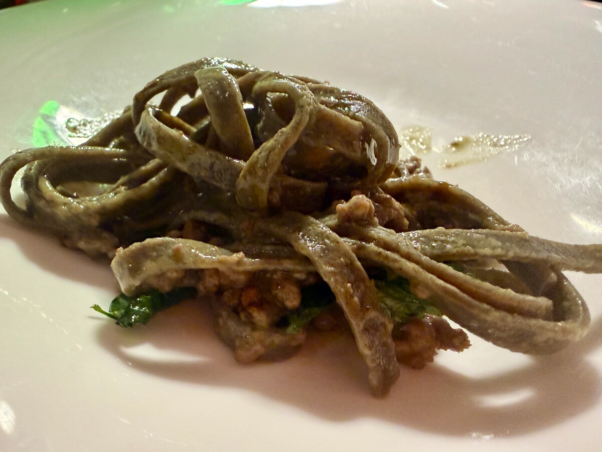 si torna a volare alto con le eccezionali Fettuccine di grano arso al ragù di lepre, liquirizia e prezzemolo, nelle quali la forza della selvaggina è tale da fare quasi della pasta il suo riuscitissimo supporto.